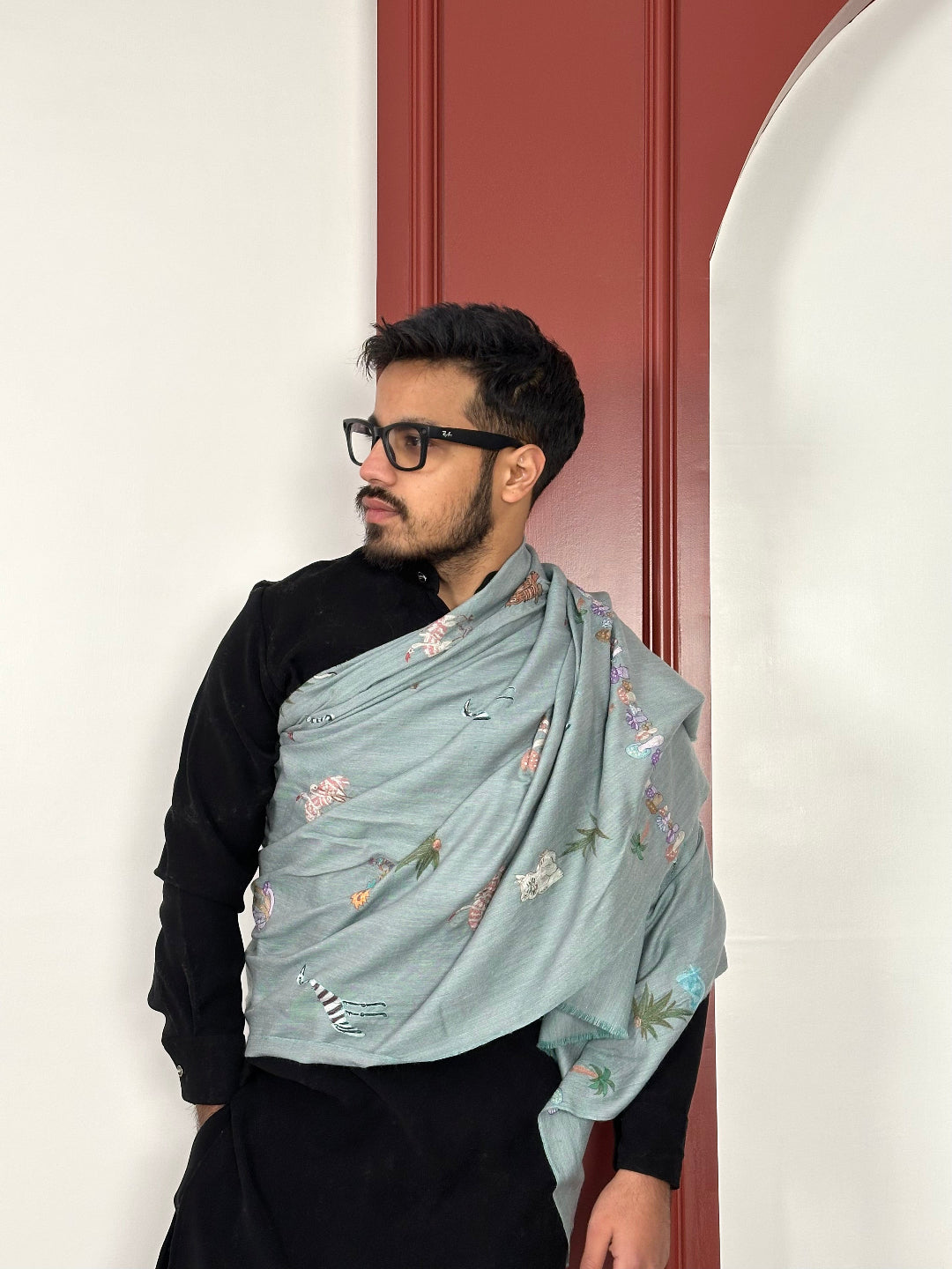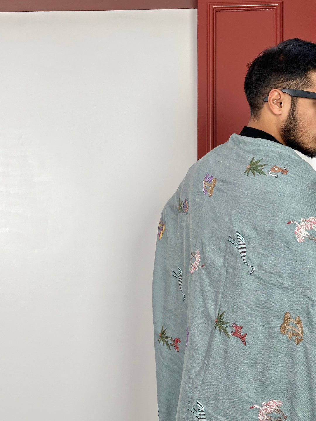 ANIMAL SCENERY BUTI PAIR TEAL COLOR PASHMINA SHAWL